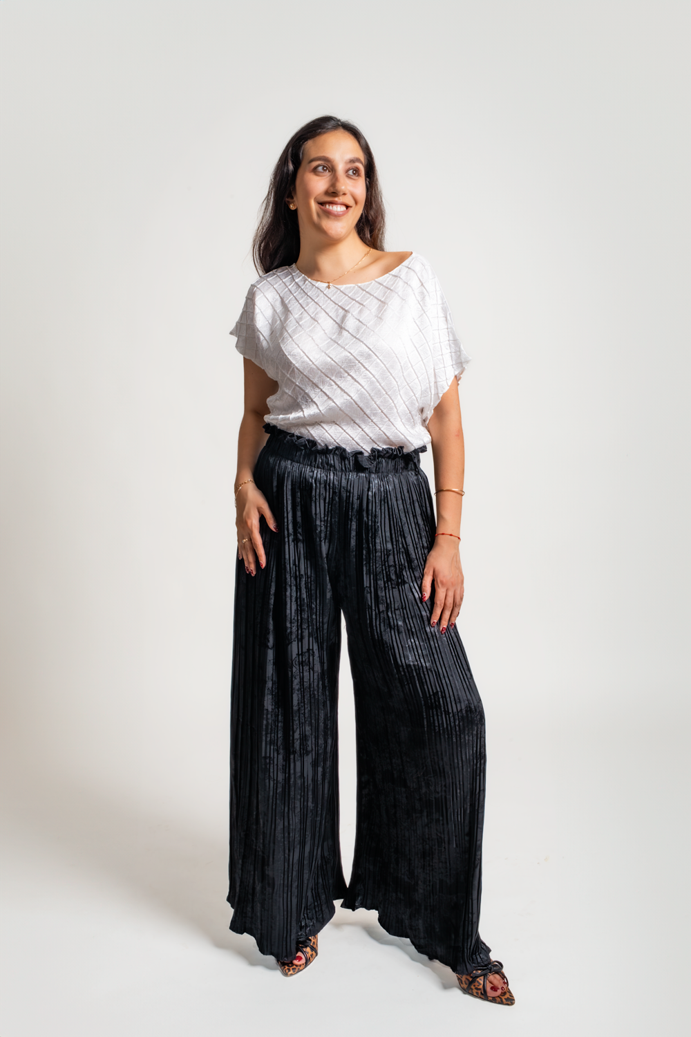 Blusa plisada con textura y manga corta de color entero pero con un brillo especial, una pieza básica pero elevada. Los plisados aportan dinamismo y textura sin adherirse al cuerpo. Una prenda lo suficientemente sofisticada para eventos formales, pero también práctica y cómoda para el día a día.